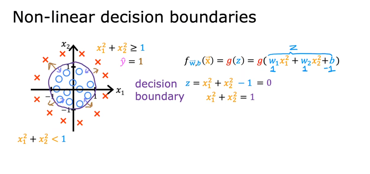 这是一个非线性的决策边界,带入合适的参数值我们可以看到一个圆形的决策边界。