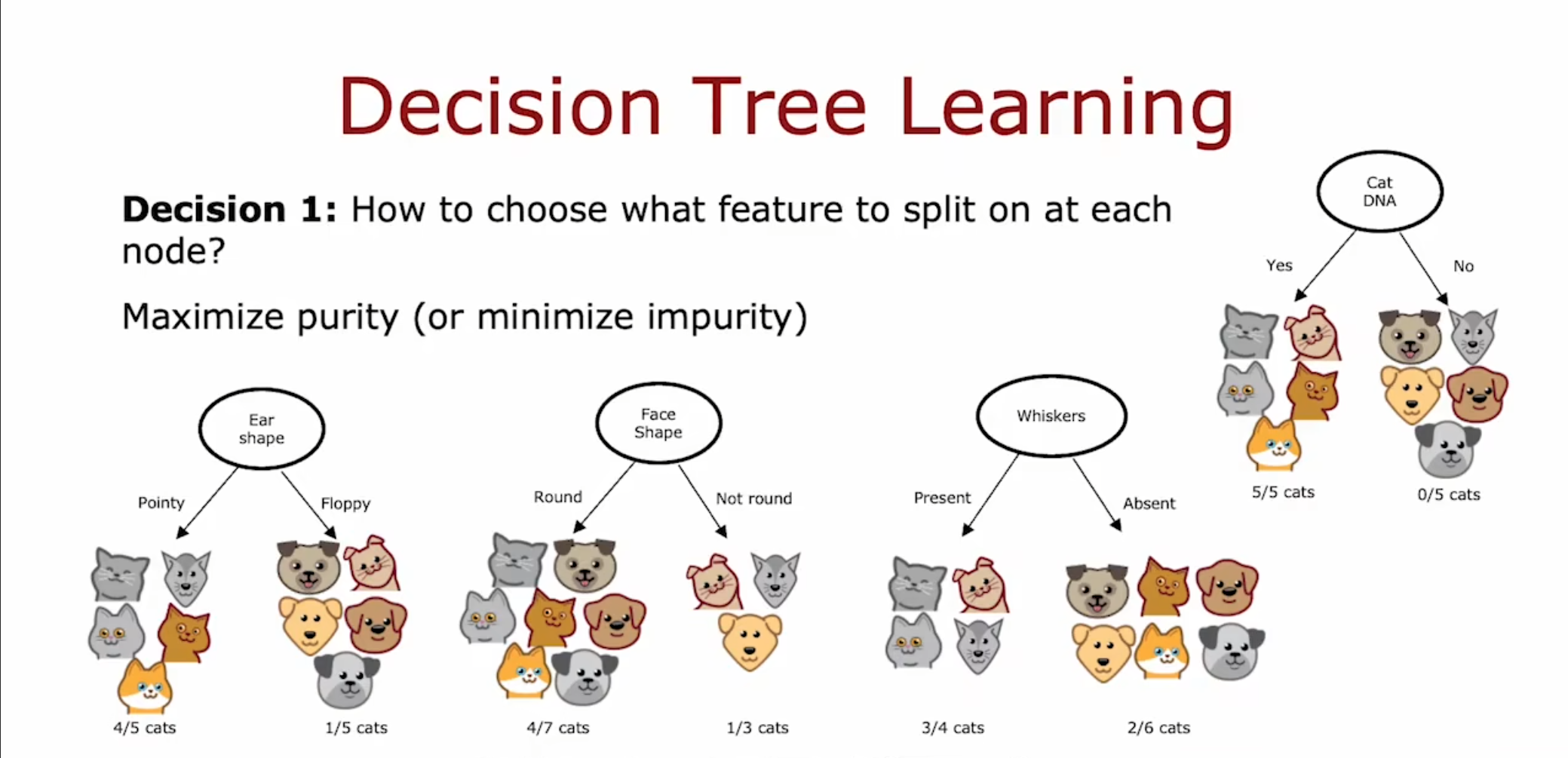 第一步:决定每个节点应该使用什么特征,尽量使得分离后的纯度更大或者杂质更少。