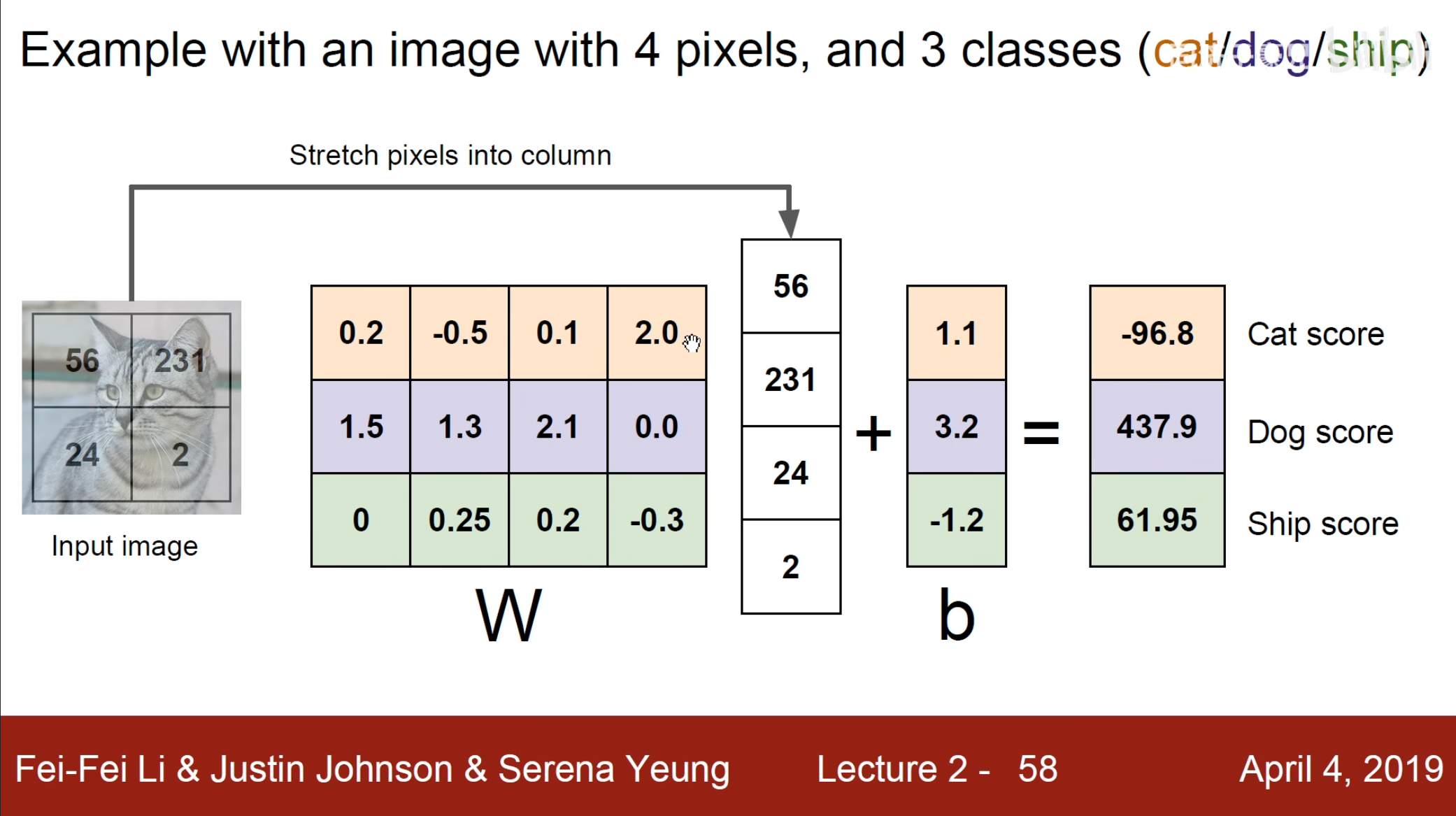 使用这个例子,我们猫的图片有四个像素点,因此就伸长为一个$ 4\times1 $的列向量,同时因为需要划分为$ 3 $类,因此需要一个$ 3\times4 $的权重矩阵,最后加上偏置即可。